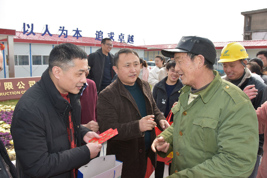 2019年2月5日己亥年春節大年初一,公司法人代表、總經理尚超軍,公司黨委書記徐向峰一行,來到通呂運河水利樞紐工程項目部,看望和慰問春節期間堅守在一線的項目管理人員、施工作業人員及家屬,并現場分發了新年紅包和慰問品,向他們致以新春的問候和美好的祝福,向全力支持員工工作的家屬表示誠摯的感謝。